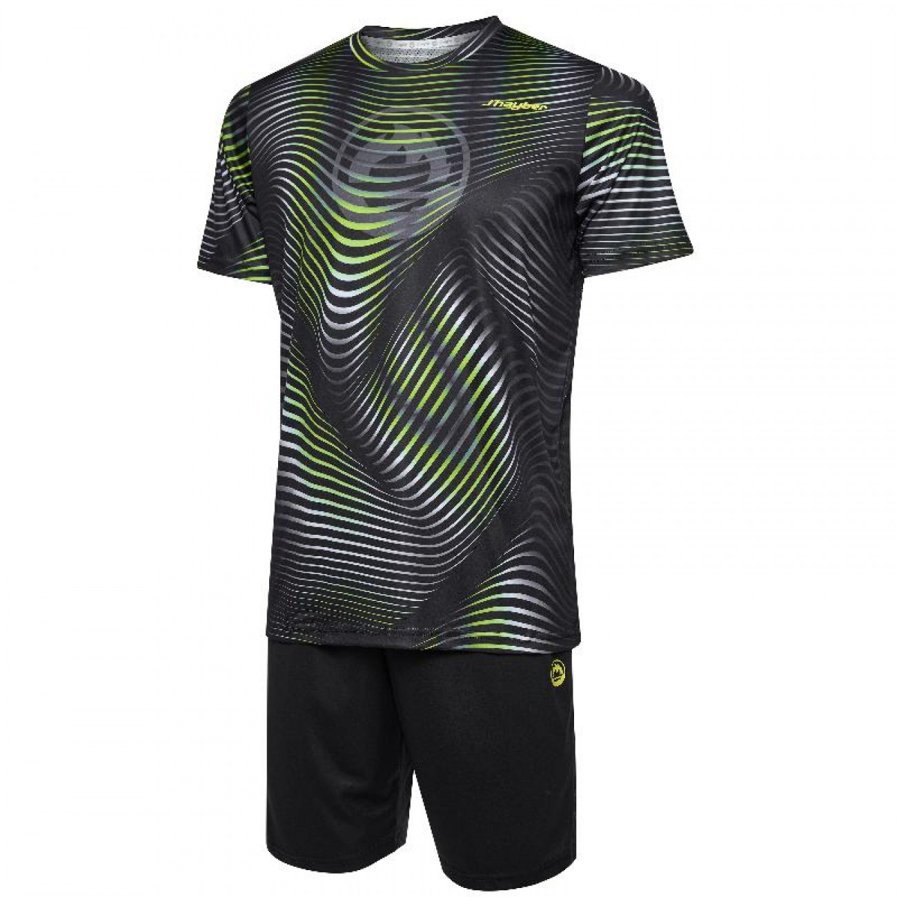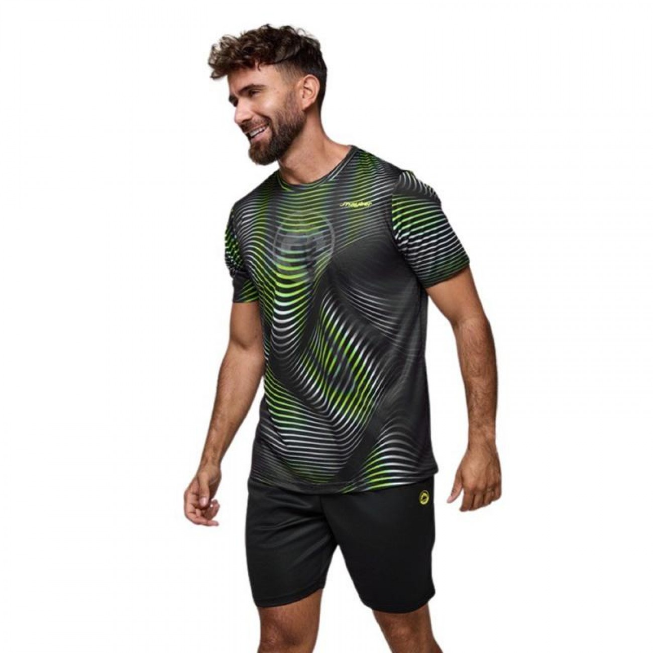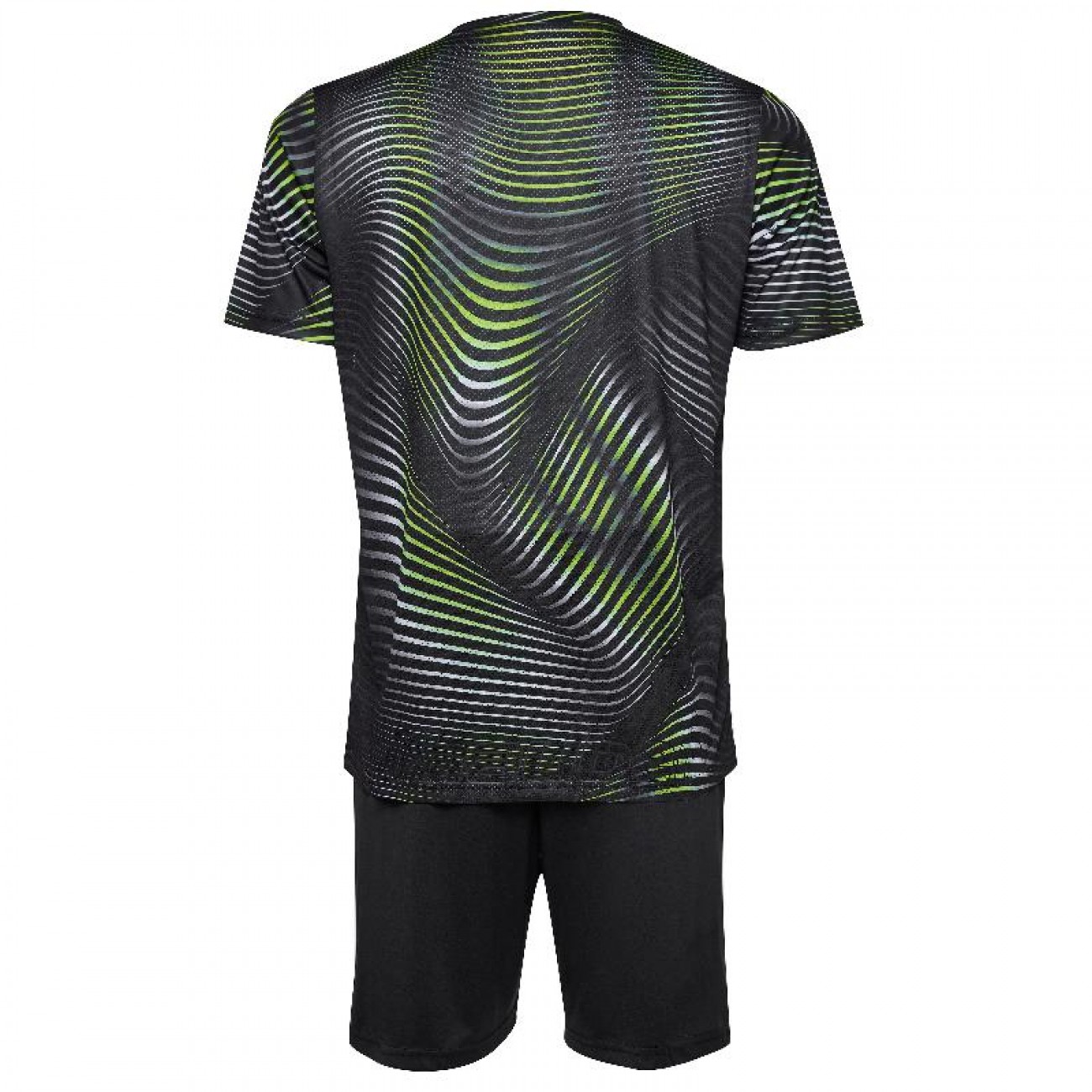 Su camiseta destaca por un diseño ondulado en tonos dinámicos que aporta energía y movimiento, mientras que el pantalón equilibra el look con un estilo más sobrio y contrastado.